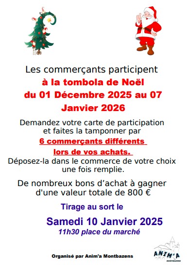 A l’initiative de l’association ANIM’A MONTBAZENS, les commerçants de Montbazens partenaires de l’opération vous proposent de participer à une tombola du 1er décembre 2025 au 7 janvier 2026. Le règlement est disponible auprès de tous les commerçants participants. Lors de vos achats, demandez votre carte de participation et faites-la tamponner par 6 commerçants différents participants […]