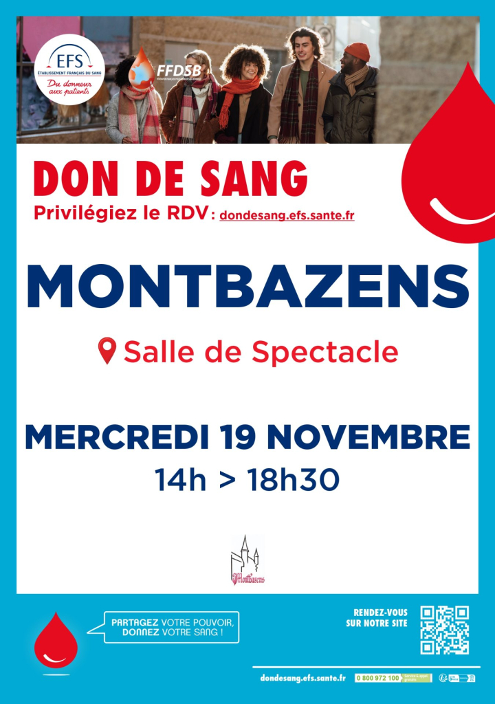 Prochaine collecte de sang à Montbazens le mercredi 19 novembre 2025 de 14h à 18h30 à la Salle de Spectacle.