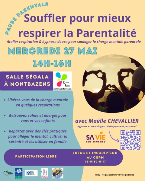 Souffler pour mieux respirer la parentalité, à la salle Ségala au CSPM de 14 h à 16 h. Atelier respiration et hypnose douce pour soulager la charge mentale parentale. Avec Maëlle CHEVALLIER, hypnose et coaching en développement personnel. Informations et inscriptions 05 65 80 45 47. Participation libre. (Centre social du plateau de Montbazens)